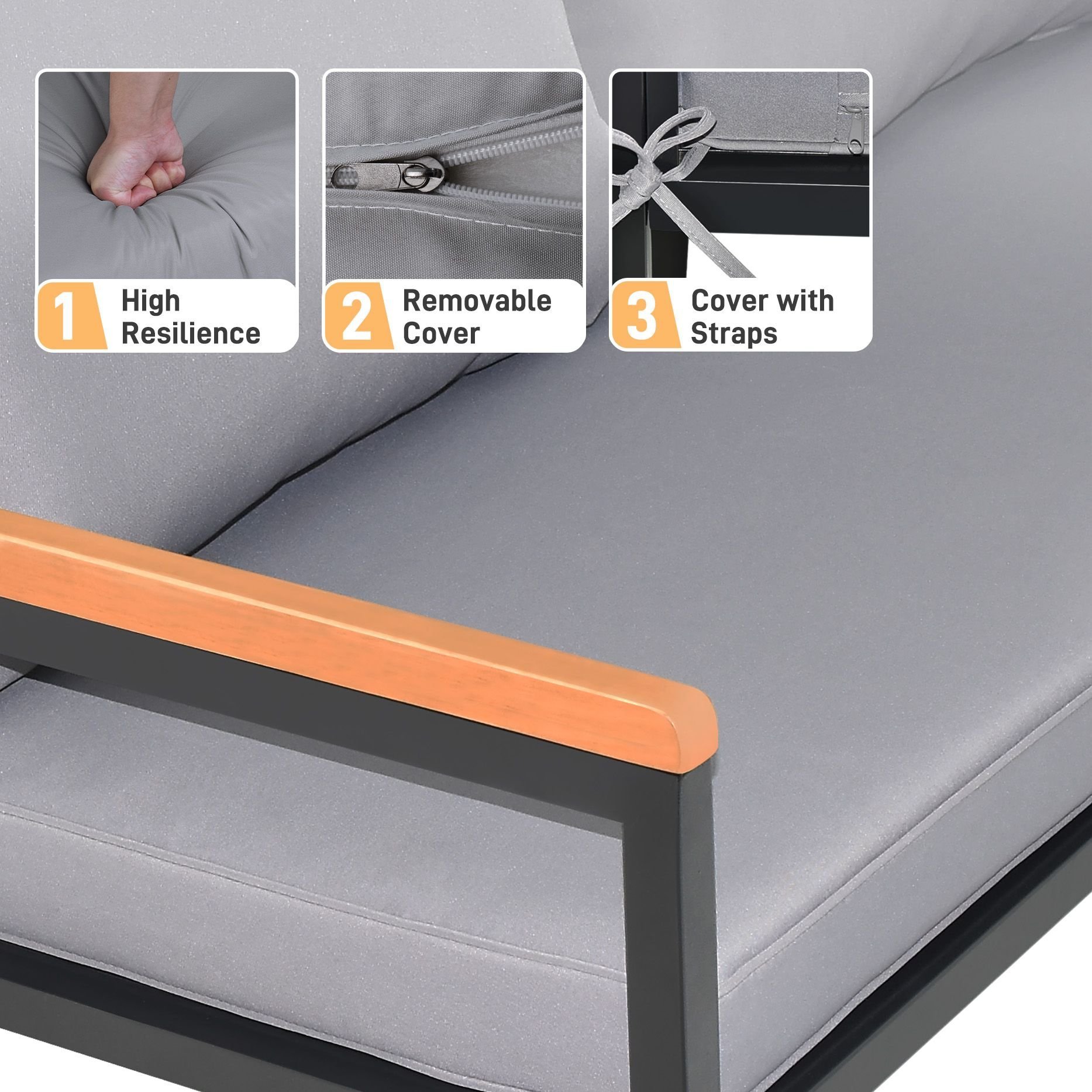 1. Modern Stylish Design: Enhance your outdoor space with this trendy patio set that adds a chic touch and seamlessly blends with any decor. Acacia wood armrests and tabletop add a touch of natural elegance to the set and elevate the overall aesthetic