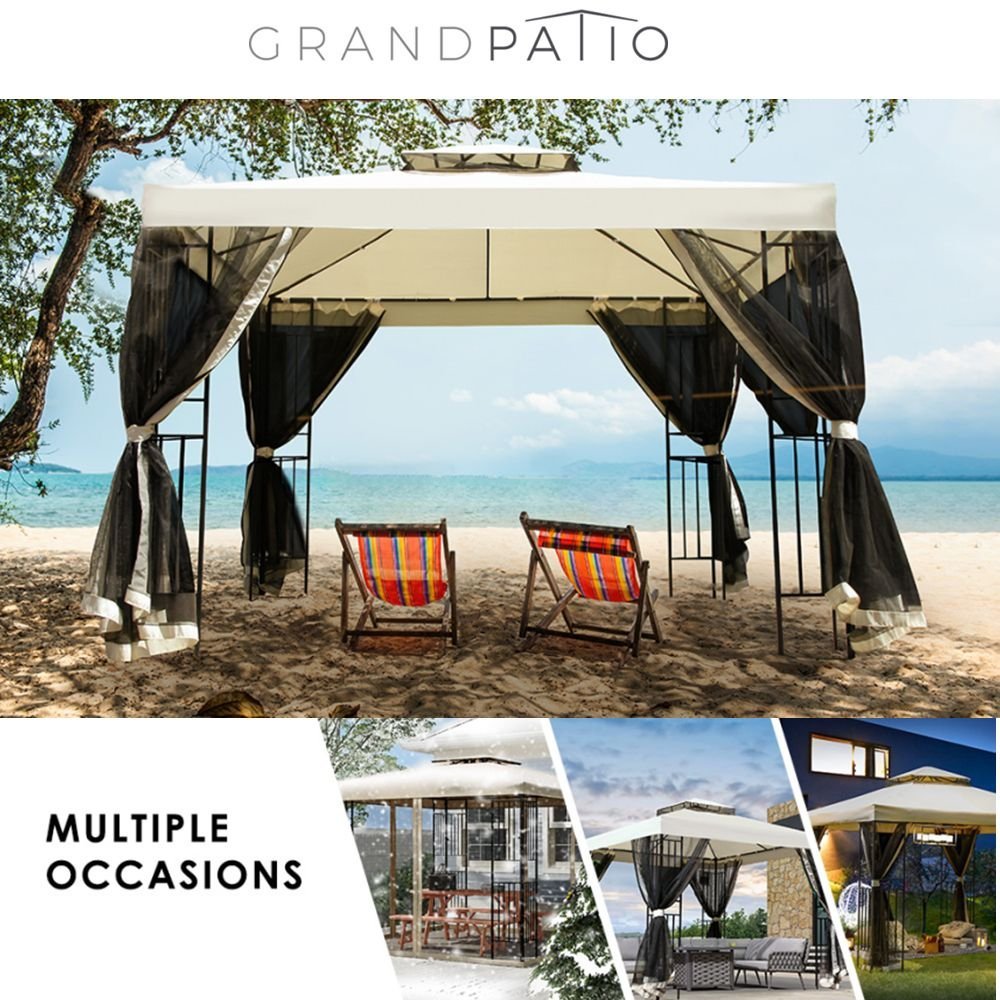 Combines a magnificent backyard design with plenty of sun shade protection, create a wonderful depth for your outdoor space. The sturdy, safe, steel construction with special attention to quality and durability, will last for years to come. The steel construction with a durable, rust resistant, powder coated finish. Stylish, convenient and functional.Exceed your expectations in the products you buy. Features: High quality mosquito netting w/ zippers, fully enclosed keep you from disturbing of mosquitos and other insect Double-tier top cover design not only looks good but also to make Good ventilating High grade powder coated steel frame resists rust, chipping and peeling UV treated polyester canopy for durable shade, protecting you from the sun and rain Ideal for daily or recreational use, such as parties, outdoor events, camping, picnics and any other occasion