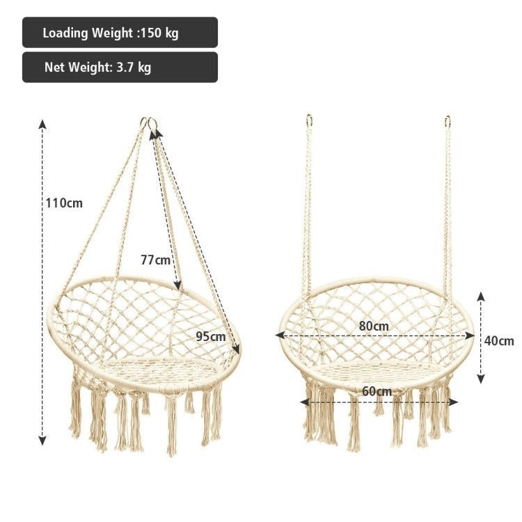 3.Sturdy and Durable Craftsmanship: Handmade from thick cotton rope and steel frame, this hanging swing chair can support up to 330 lbs weight, multi-layer woven rope builds the merely zero extension.
