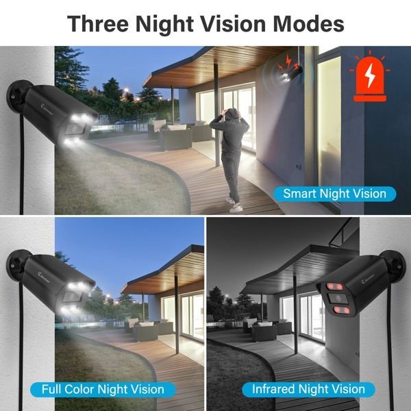 SMART NIGHT VISION Three smart night vision modes provide clear full color or black-and-white pictures, even in complete darkness. Different modes can be selected through the app, or you can set the smart night vision to protect your property by setting the alarm time period |