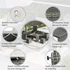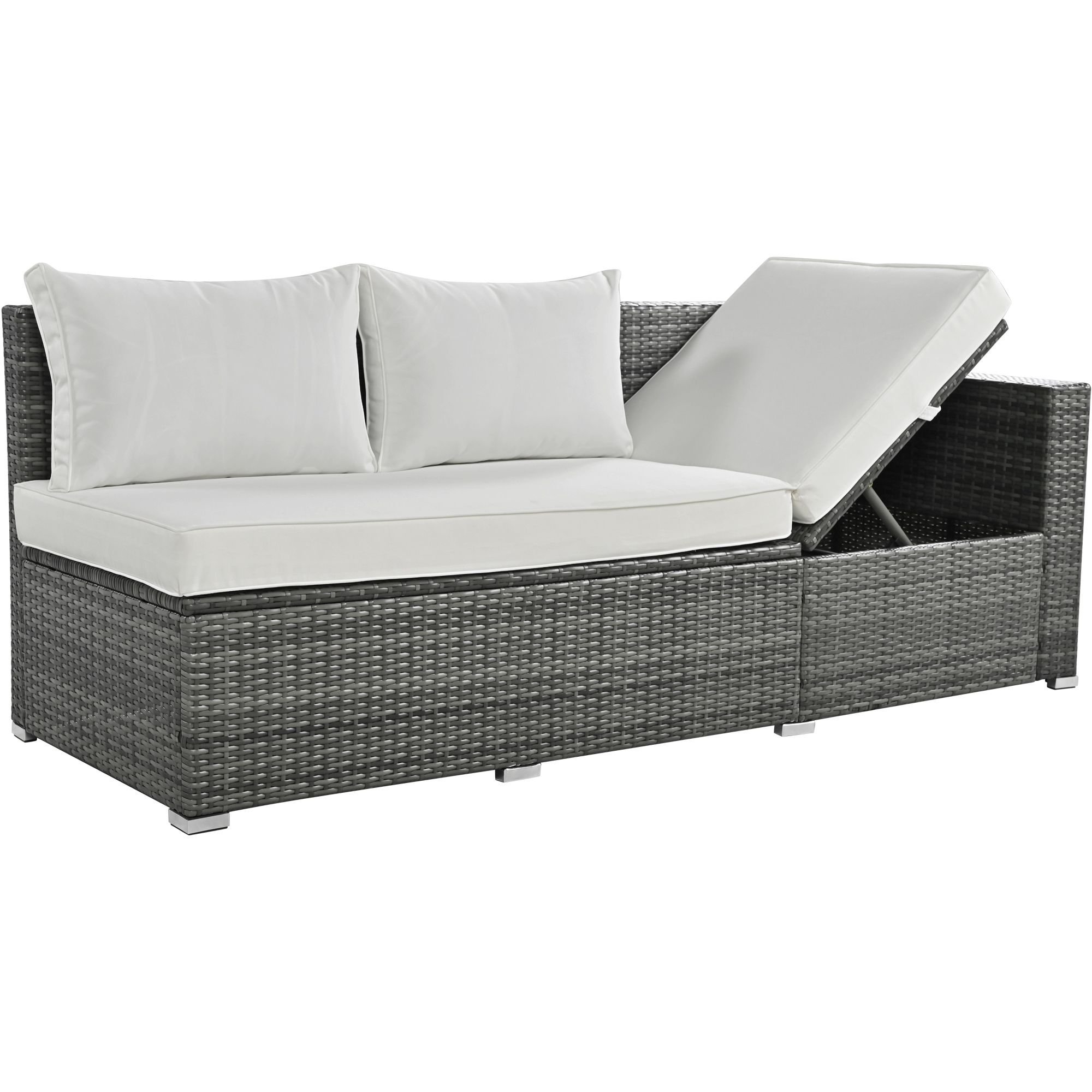 This patio rattan sofa set has a number of storage options that make it a great choice for outdoor use.The loveseat sofa features an openable seat that provides ample storage space for cushions and other items, keeping them out of sight and protected from the elements.In addition to the seating options, the set also includes a gas lift storage box that provides even more storage space for outdoor essentials and is perfect for storing larger items, such as outdoor pillows. Storage capacity for loveseat is 69 gallons and for storage box is 94.6 gallons