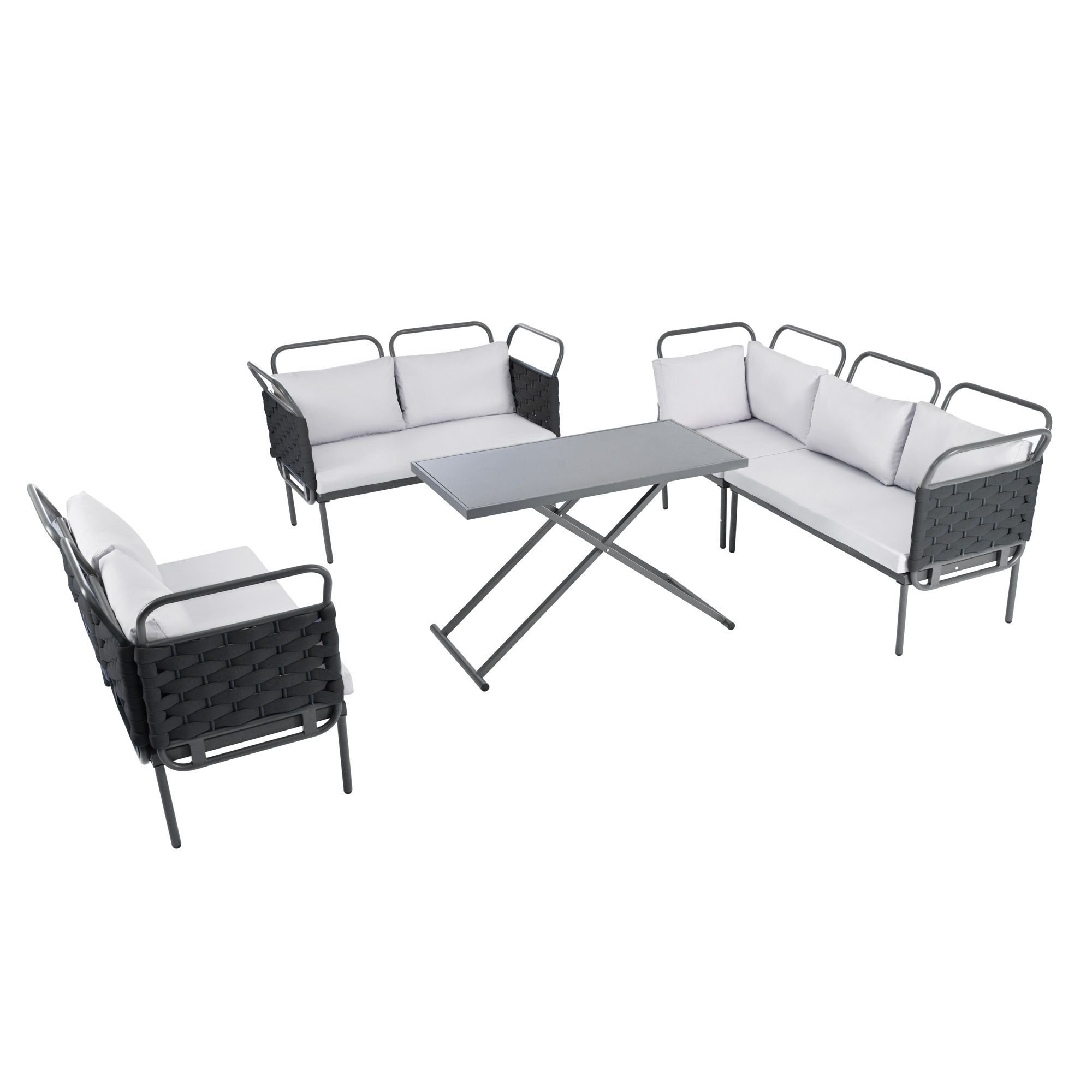 | Summary | Looking to turn your backyard into the envy of the neighborhood without breaking a sweat? Our 5-piece sofa set is your answer! Designed to comfortably seat up to 7 people, it boasts a durable metal frame, chic woven rope, and allows for various configurations. This ensemble includes 3 loveseats, 1 corner sofa with ergonomically curved backrests and armrests, plus a fashionable glass table with cross legs. It's accessorized with 8 pillows and 4 cushions, all featuring water-resistant, all-weather fabric with removable and washable covers, in 2 stylish colors. Perfect for any outdoor gathering! |